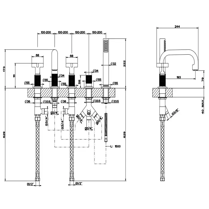 Gessi Inciso+ Смеситель для ванны на 4 отверстия для наполнения через слив-перелив, переключатель, шланг 1,50 м, цвет: black XL