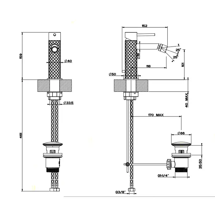 GESSI 316 Смеситель для биде на 1 отверстие с донным клапаном, излив 118мм, цвет: steel brushed