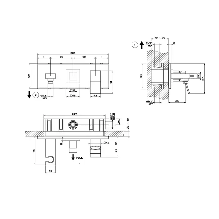 Gessi Rettangolo K Встраиваемый смеситель, с подводом воды, держателем лейки и переключателем PULL, внешняя часть, цвет: хром