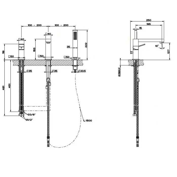 Gessi Rettangolo K Смеситель для ванны на 3 отверстия, с встроенным в излив переключателем и ручным душем, цвет: black XL