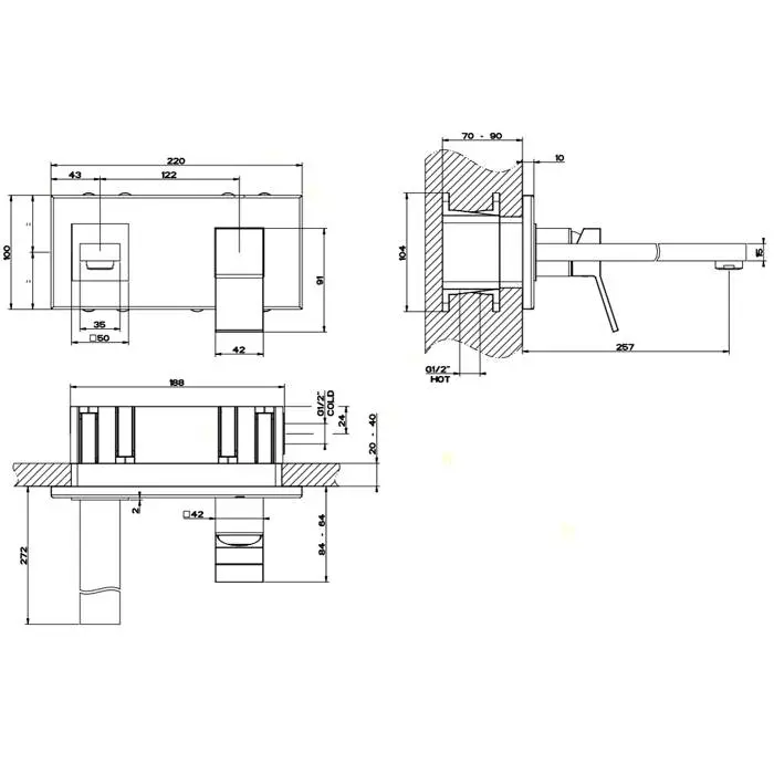 Gessi Rettangolo K Встраиваемый однорычажный смеситель для раковины, излив 249мм(внешние части), цвет: хром