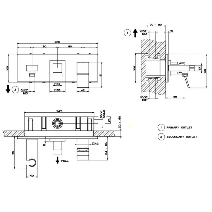 Gessi Rettangolo K Встраиваемый смеситель, с подводом воды, держателем лейки и переключателем PULL, внешняя часть, цвет: хром