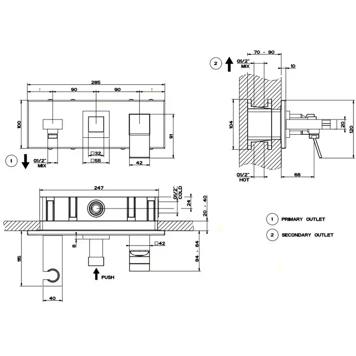 Gessi Rettangolo K Встраиваемый смеситель, с подводом воды, держателем лейки и переключателем PUSH, внешняя часть, цвет: хром