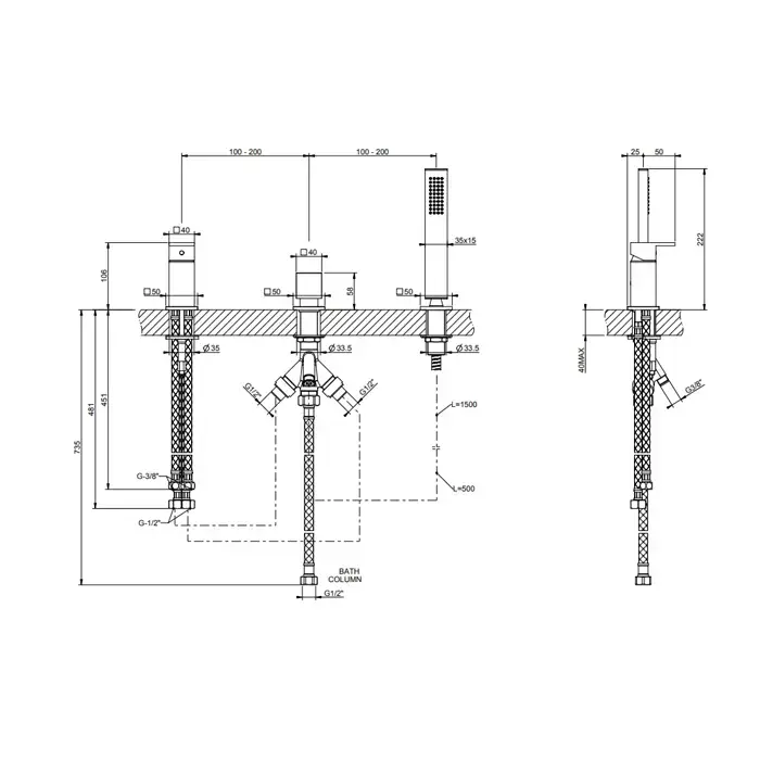 Gessi Rettangolo Смеситель для ванны на 3 отверстия, с переключателем и ручным душем, без излива, цвет: черный