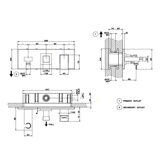 Gessi Rettangolo Встраиваемый смеситель с изливом, подводом воды, держателем лейки и переключателем PULL(внешние части), цвет: хром