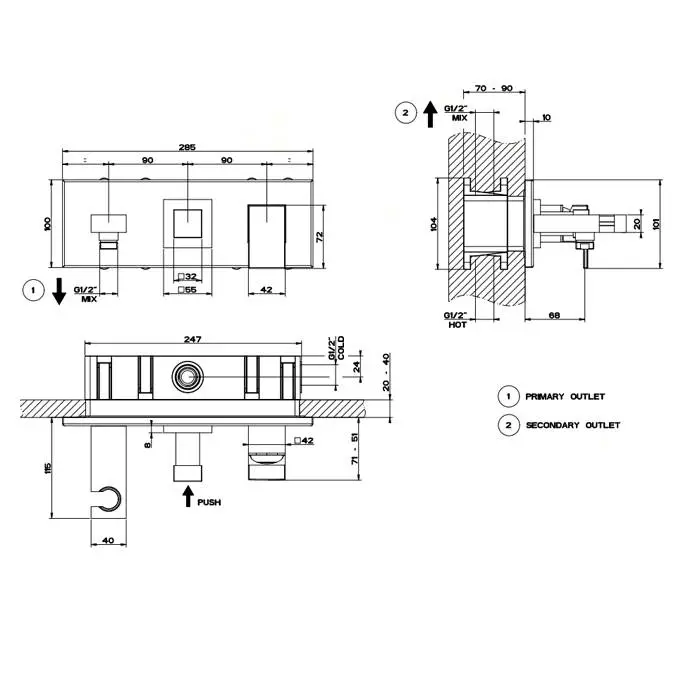 Gessi Rettangolo Встраиваемый смеситель на 2 позиции, подводом воды, держателем лейки и переключателем PUSH(внешние части), цвет: хром
