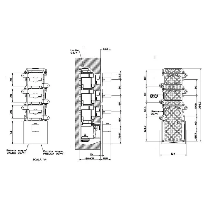Gessi Rettangolo Встраиваемый термостат, подключение на 3/4", с 3мя независимыми выходами(внешние части), цвет: хром