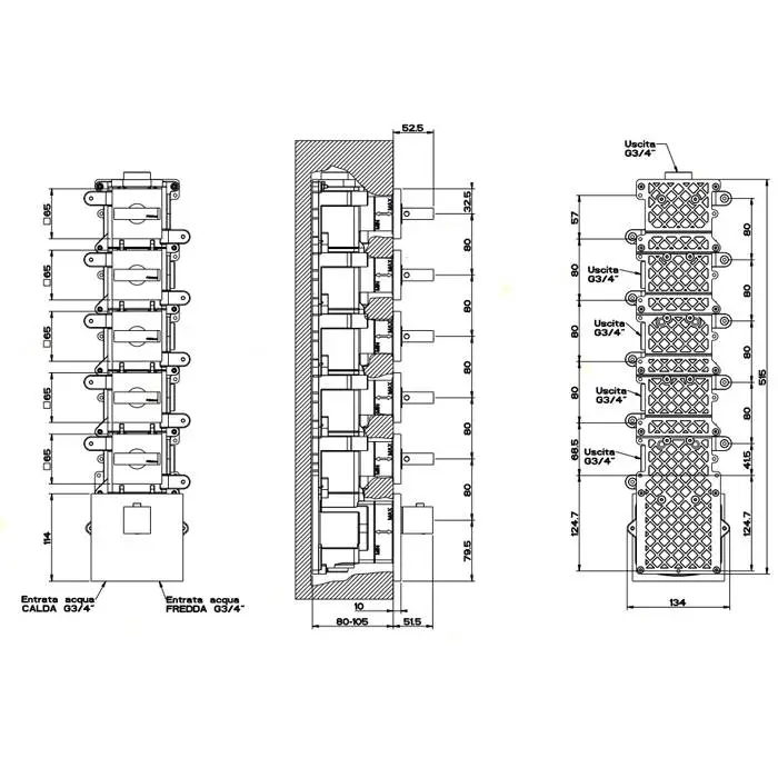 Gessi Rettangolo Встраиваемый термостат, подключение на 3/4", с 5ю независимыми выходами(внешние части), цвет: хром