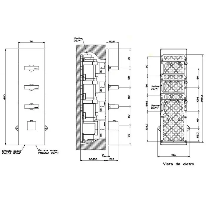 Gessi Rettangolo Встраиваемый термостатический смеситель, подключение на 3/4", с 3мя независимыми выходами, внешняя часть, цвет: хром