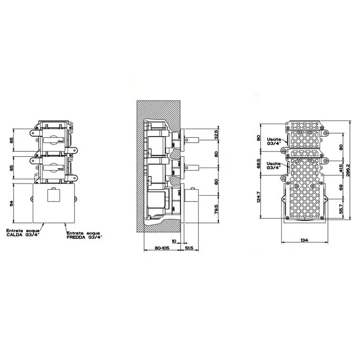 Gessi Rettangolo Встраиваемый термостат, подключение на 3/4", с 2мя независимыми выходами(внешние части), цвет: хром