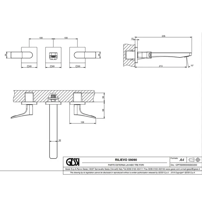 GESSI Rilievo Встраиваемый смеситель для раковины на 3 отв, с изливом 213мм (внешние части), цвет: хром