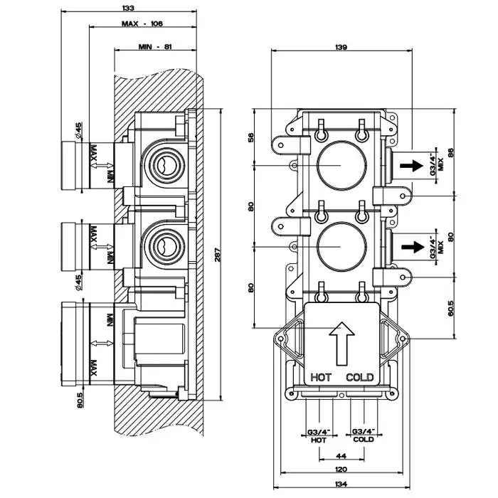 Gessi Внутренняя часть встраиваемого термостатического смесителя с 2мя независимыми выходами