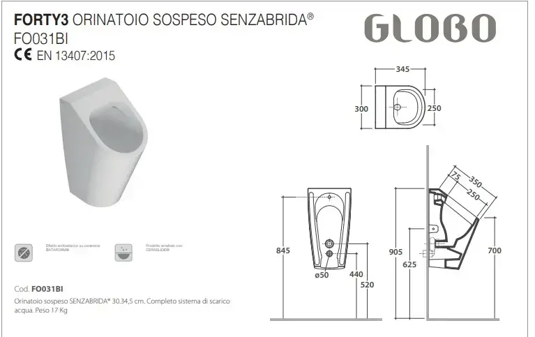 Globo Forty3 Писсуар 30х35х56см., подвесной, безободковый, крепежи в компл, цвет: белый