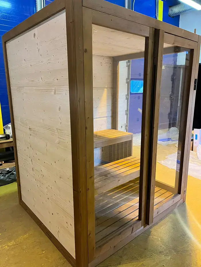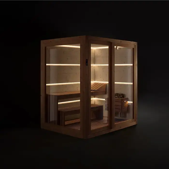 TREESSE AURA сауна 180х150х216Н, SX (левый вариант), подсветка, фронтальная дверь стекло/дерево (БЫЛА на ВЫСТАВКЕ и через 4 дня упакована!!)