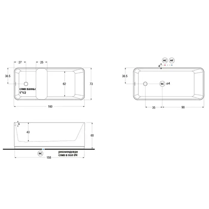 Gruppo Treesse Cross Ванна отдельностоящая 160х73х60 см., с сливом-переливом и сифоном, Solid Surface, цвет: белый глянцевый
