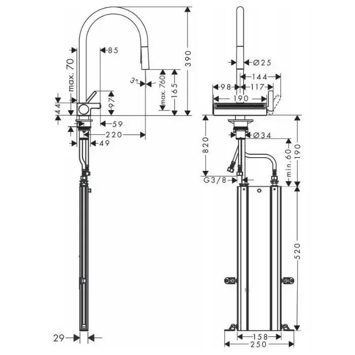 HG Aquno Select M81 Смеситель кухонный, на 1 отв, поворотный излив 220мм с вытяжным душем, 3jet, h164мм,+каскад, sBox, цвет: хром