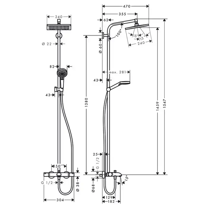 HG Crometta Showerpipe E 240: термостат для ванны, стойка с верхним душем 240х240мм, ручной душ со шлангом 160мм, цвет хром