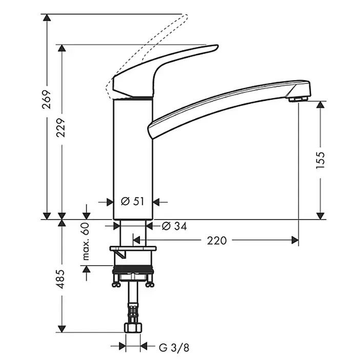 HG Focus Смеситель для кухни, на 1 отв., поворотный излив 220мм, h155мм, 1jet, цвет: хром