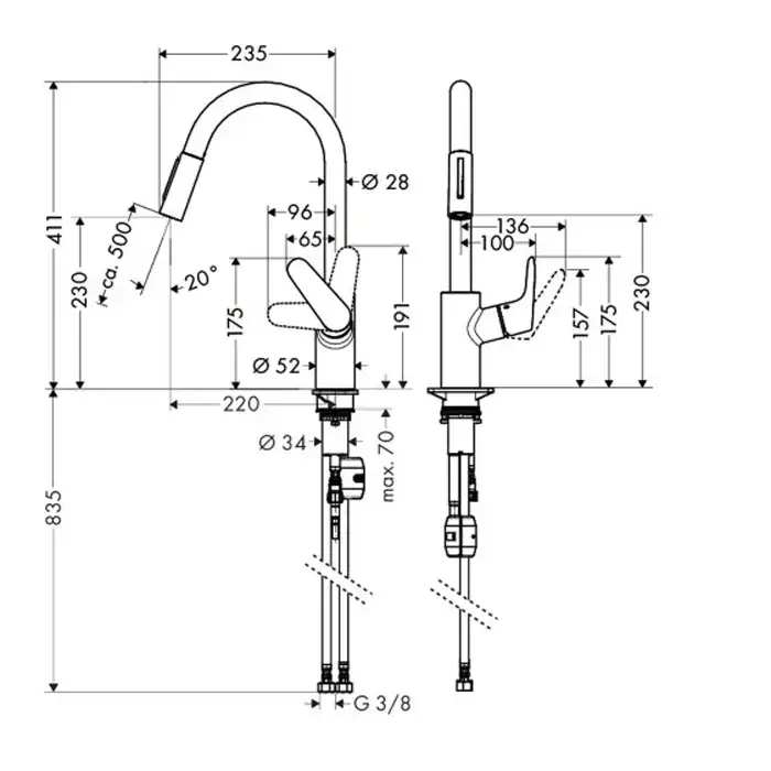 HG Focus Кухонный смеситель, на 1 отв., поворотный и вытяжной излив 220мм, h225мм 2jet, цвет: хром