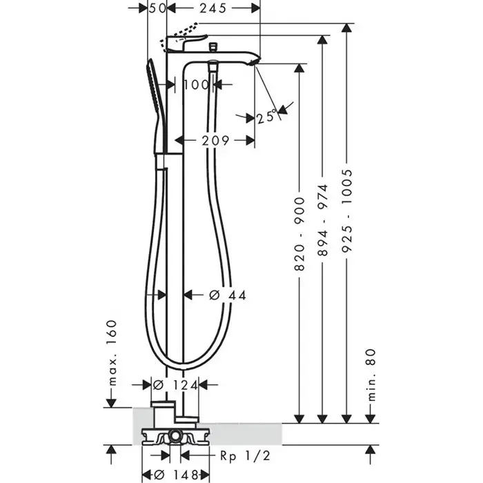 HG Metris Смеситель для ванны, напольный, излив 209мм, переключатель вакумный, ручной душ 1jet, цвет: хром