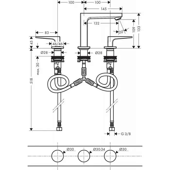 HG Metropol Смеситель для раковины 110, на 3 отв, с донным клапаном, излив 132мм, цвет: хром