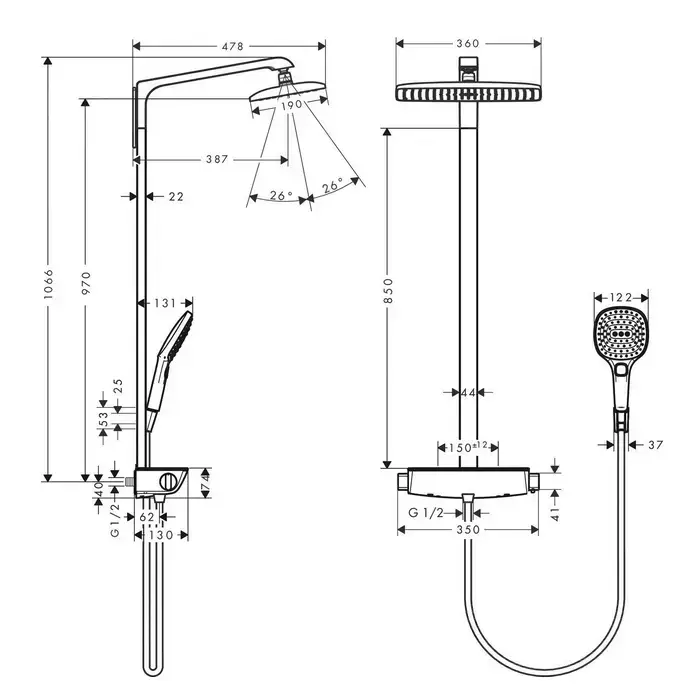 HG Raindance E Душевая система Showerpipe: верх.душ 360х190мм 1jet, ручн.душ, шланг, термостат для душа, EcoSmart, цвет: хром