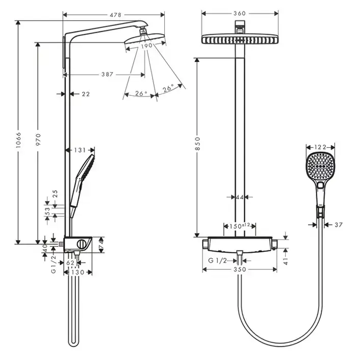 HG Raindance Select 360 Showerpipe Душевая стойка с верхним душем: 360x190 мм, и ручным душем, термостат, цвет: хром