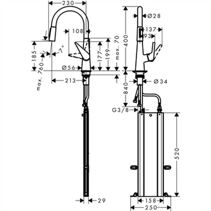 Hansgrohe Metris M71 Смеситель для кухни, на 1 отв, поворотный излив: 23.5см с вытяжным душем, 2jet, h: 33.3см, sBox, цвет: хром