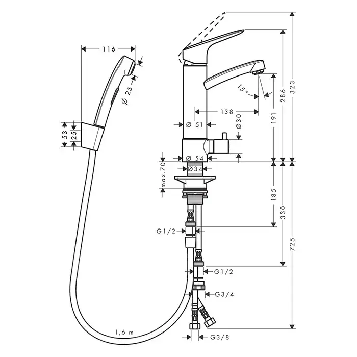 HG Logis Набор для биде: смеситель для раковины на 1 отв, излив 138мм, h191мм, душ бидетте с держателем и шланг 1,6м, цвет: хром