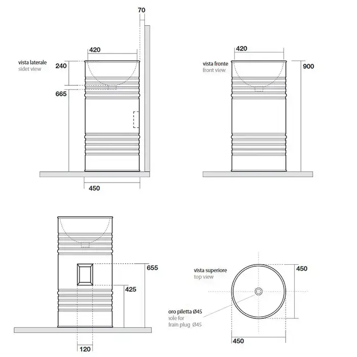 Kerasan Artwork Раковина свободностоящая "BARREL" d 45,H 90 см, без отв под смеситель, слив в стену, цвет: Grigio matt