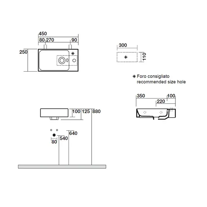KERASAN Cento раковина 45х25см с 1отв под смеситель справа - DX, (с отверстиями для крепления к стене), цвет белый