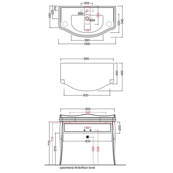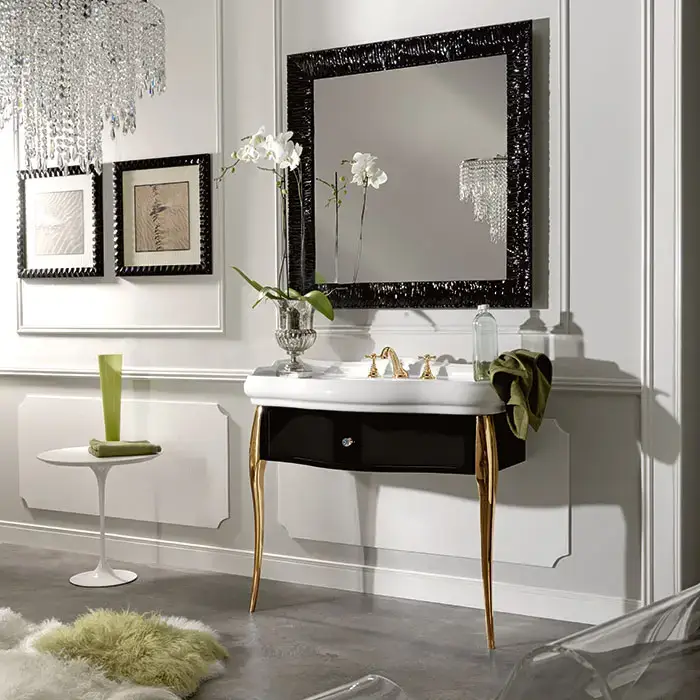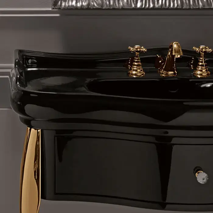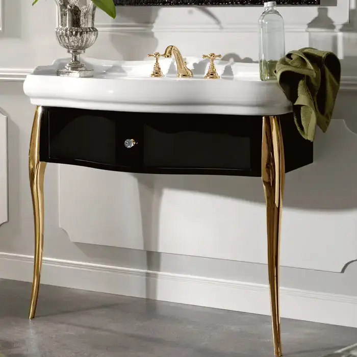 KERASAN Retro 7363K4, база 100см, под раковину 1050, цвет: черный глянц, ножки (арт.736291):золото, ручки: кристалл/кольцо-золото (упаковка-2 коробки)