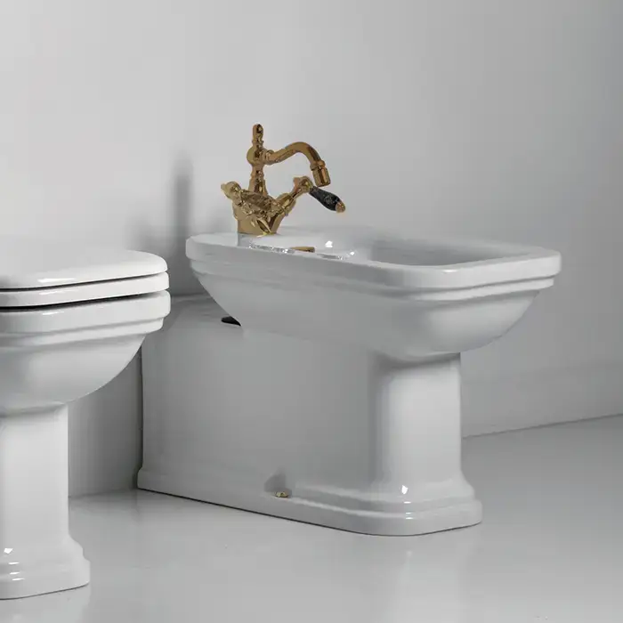 Kerasan Waldorf Биде напольное пристенное удлиненное "Prolongato" 65х37см с 1 отв. под смеситель, цвет: белый/бронза