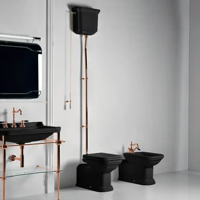 Kerasan Waldorf Унитаз пристенный удлиненный, с высоким бачком - уст-ка на расстоянии 2см от стены и трубой, цвет: черный/золото