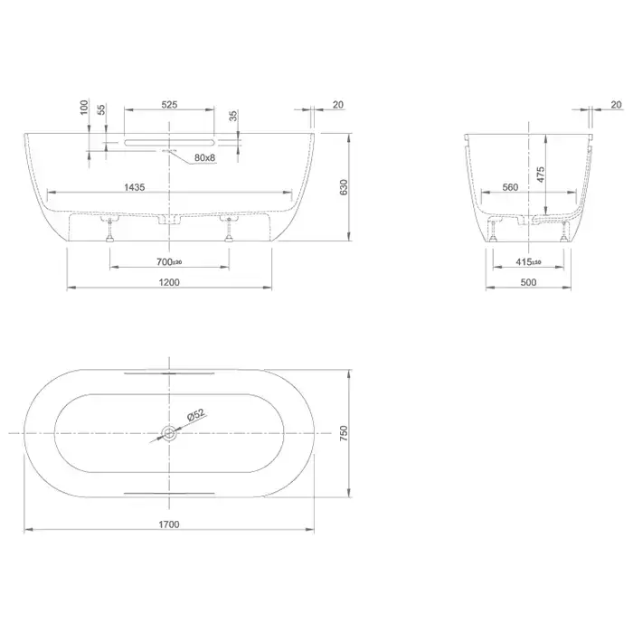 KNIEF Lotus Ванна отдельностоящая из материала Stone 170х75х63 см, с переливом и выпуском Click-Clack хром, без ручек, цвет:белый матовый