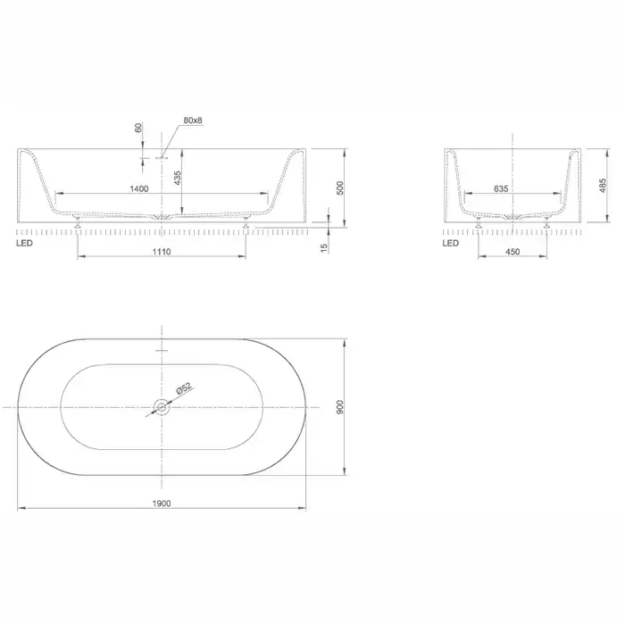 KNIEF Moon ванна отдельностоящая 190x90x50 cm, c встроенной LED подсветкой ,с слив переливом , цвет белый матовый