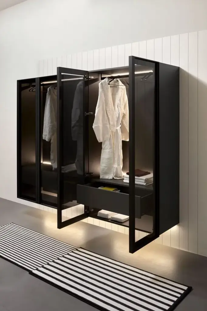 Колонна-гардероб, с внутренней LED подсветкой 90*47*175h корпус skin cenere/рама nero opaco/стекло transperente fume/задн.панель coccodrilo lucido