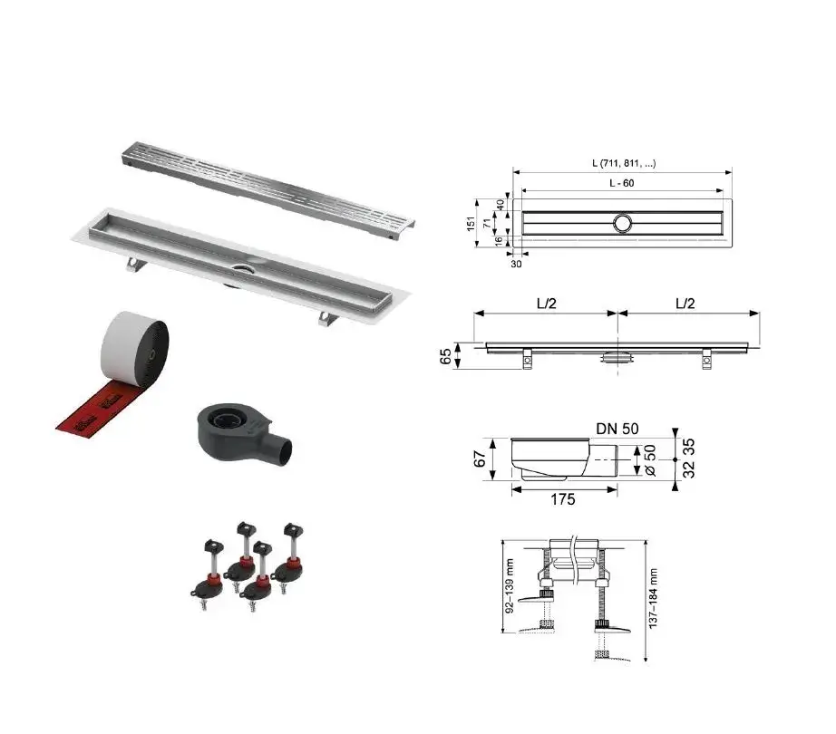 Комплект для монтажа дренажного канала с решеткой basic 70 см, нержавеющая сталь