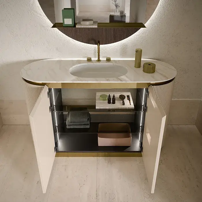 Oasis Naos Композиция №2 Комплект мебели 146х56xh85см, напольный, мраморный топ calacatta oro, цвет: лак глянцевый/золото глянцевое