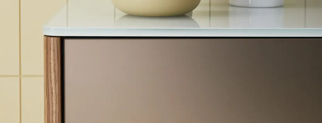 фасады-SPECCHIO FUME BRONZO SILK-E6, бок.панели-NOCE CANALETTO, столешницы-OPALITE BIANCO-20, полотенцедержатель-TITANIO, разделители-FUME, сифон-CHROME