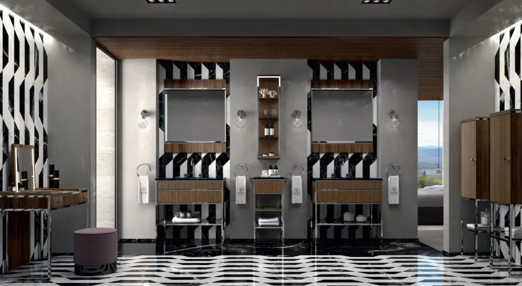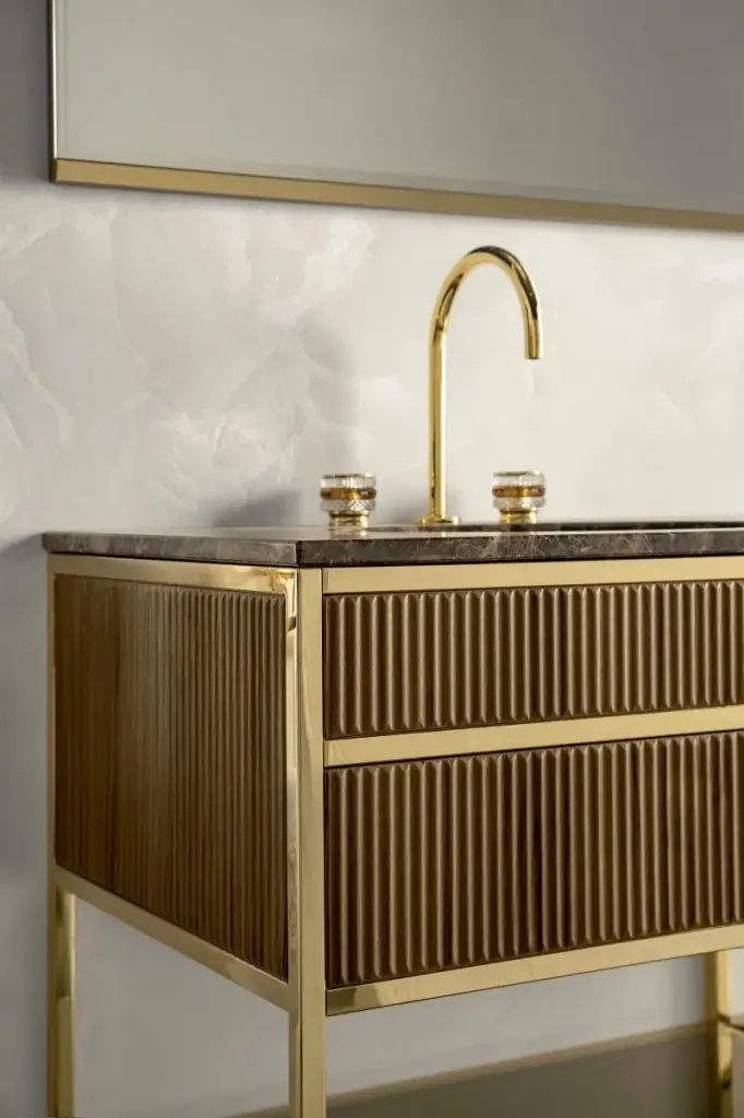 золото, ribbed walnut, мрамор mistic brown, раковина черная керамика