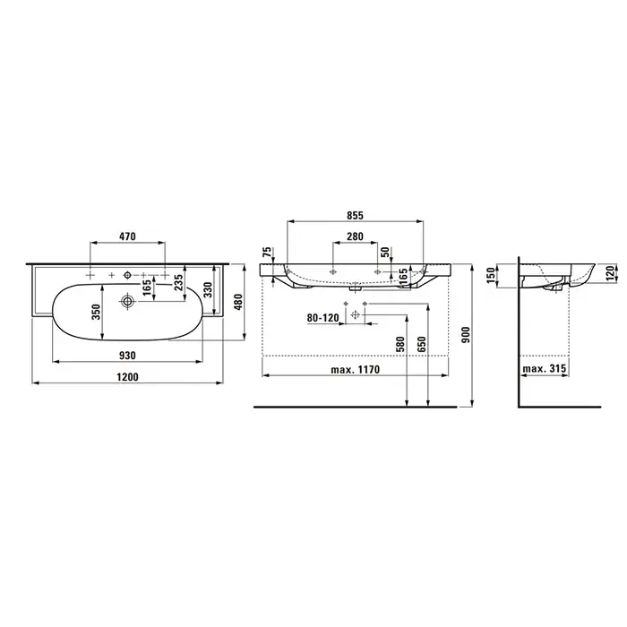 Laufen New Classic Раковина накладная овальная 1200х480х75 мм, с 3 отв под смеситель,с переливом, цвет белый