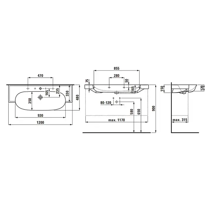 Laufen New Classic Раковина накладная овальная 1200х480х75 мм, с 3 отв под смеситель,с переливом, цвет белый матовый
