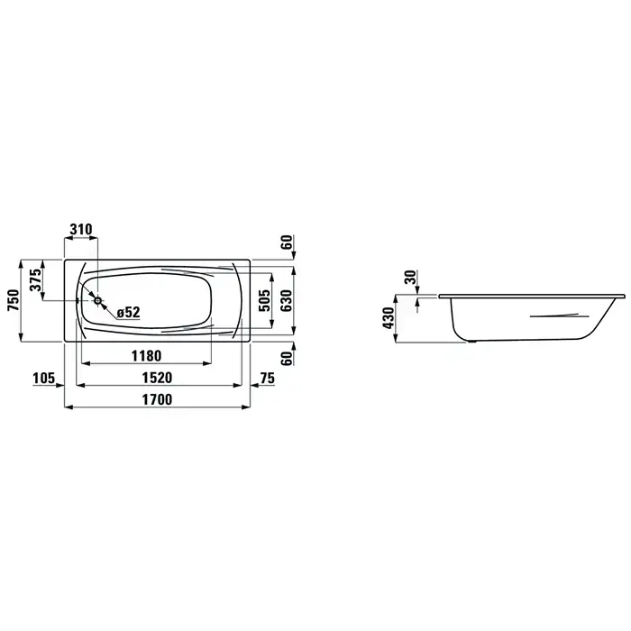 Laufen Palladium Ванна встраиваемая, 170x75см., эмалированная сталь (3,5 мм), шумоизоляционное покрытие, с отверстиями для ручек, цвет: белый