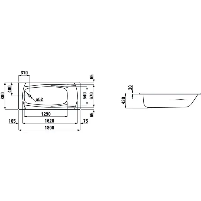 Laufen Palladium Ванна встраиваемая, 180x80см., эмалированная сталь (3.5 мм), шумоизоляционное покрытие, без отверстий для ручек, с антискользящим покрытием, цвет: белый