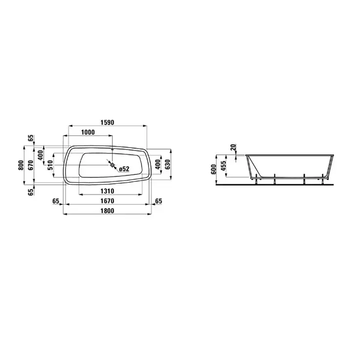Laufen Palomba Ванна 180x80x45.5см, встраиваемая, ассиметричная, без слив-перелива, борт 20мм, с каркасом, материал: акрил, цвет: белый