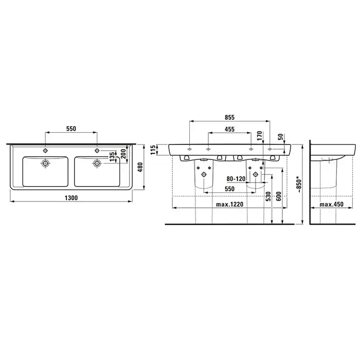 Laufen Pro S Раковина двойная 130x48х11.5см , с 1 отв., на каждую раковину, цвет: белый глянцевый