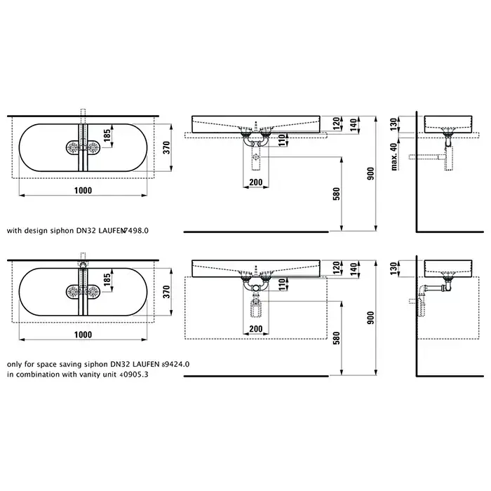 Laufen Sonar раковина двойная 1000x370x130 мм, без отверстия для смесителя, без отверстия для перелива, цвет белый матовый