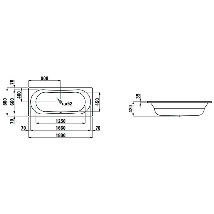Laufen Thallium Ванна встраиваемая, 180x80см., прямоугольная, с центральным выпуском, шумоизоляционное покрытие, эмалированная сталь (3,5 мм), без отверстий для ручек, цвет: белый