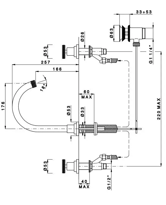 Nicolazzi Arena Смеситель для раковины на 3 отверстия, с донным клапаном, излив: 176 мм, цвет: хром